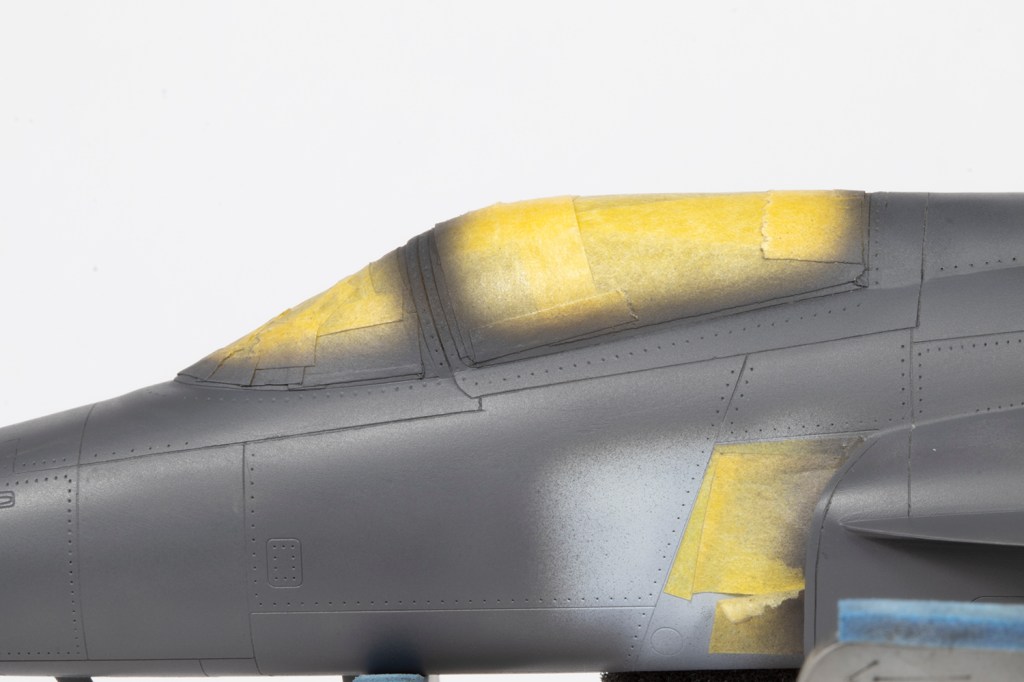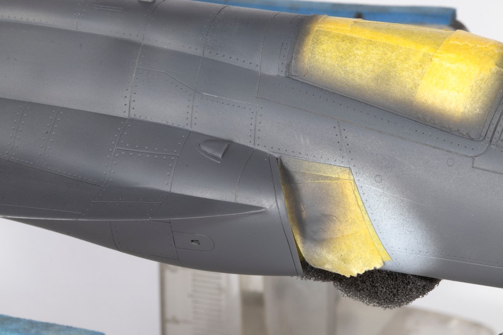 Trumpeter did not mould a particularly smooth surface to the airframe, and the irregularities irritated me as time went on. In the end, I primed with some black, not to fill the imperfections, but as a guide to knowing when the sanded surface was smooth after polishing the primer away with some 1500 grit sponge. This further revealed that quite a lot of the panel lines were shallow and indistinct, so rescribing them was necessary in quite a few areas.