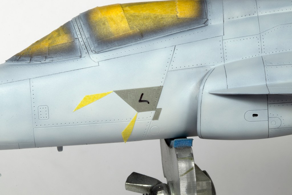 With the main colours down, my attention turned to the lightning bolts on the fuselage sides. These are not supplied by Frontpenny as decals, but they include some nifty paper templates so you can mask them up. To make life easier, I replicated the templates in vinyl using my Silhouette cutter, and airbrushed them with AKRC 252. Now, it may just be me, but I found this to be a very unstable shade. I mixed it quite thin using Mr Leveling Thinners, and during an airbrush session the colour would change, becoming increasingly darker with time. I assume this was due to pigment separation in the airbrush cup. It was actually a complete pain, and I should have used the Hataka version of the same colour which I had on the shelf, but had forgotten about.