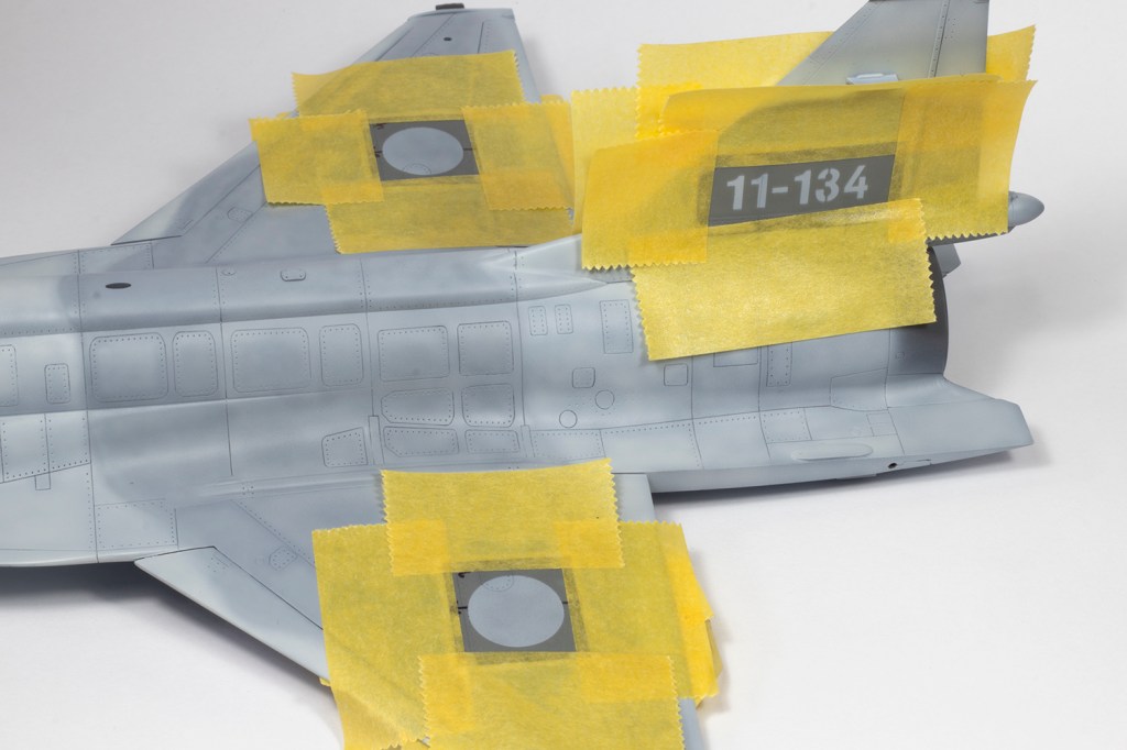 I was always planning on experimenting with glossing the decals and sanding them to remove evidence of the carrier film, a technique I’d heard about but never tried. Once they were dried, I airbrushed a lot (and I mean a lot) of clear gloss over the top of the decals – not the whole airframe, just over each decal and the surrounding area. Aquagloss is often recommended for this, but I don’t have any and it appears to have disappeared in the UK, so I used some old KColors SW100 Super Gloss I had lying around which looks very similar (i.e. a thick, milky acrylic gloss). Once left to dry for 24 hours, I set to gently wet sanding over each decal with a small piece of Infini 1000 grit sponge held in some reverse action tweezers.