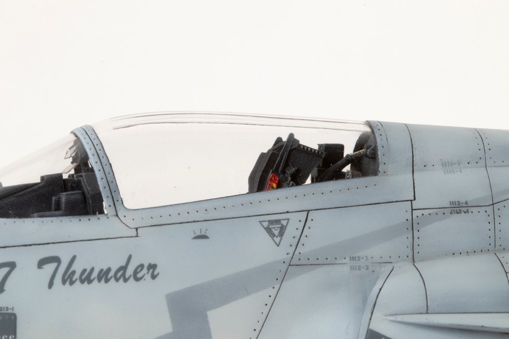 I spent a long time on the exhaust as I usually give this part of the aircraft short shrift, and the Thunder’s engine is quite complex. It’s the same engine as that in the MiG-29 and prone to developing strong brown and blue shades, often in an alternating pattern around the petals. My interpretation involves a brown undercoat, layers of MRP Smoke and Exhaust, some airbrushing with MRP Pale Blue Metal, then some raw umber inks, followed by Ammo Clear Black Blue. Ammo Silver, Steel and Gun Metal oilbrushers were next, sealed with a flat clear and overlaid with ABT502 Starship Filth, Faded Orange and Burnt Sienna. I just kept throwing stuff at it until I was happy enough. I do, however, feel that Wolfpack didn’t quite get the shape of the engine right near where it meets the fuselage, but it’s still way better than the kit part.