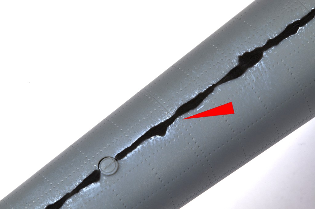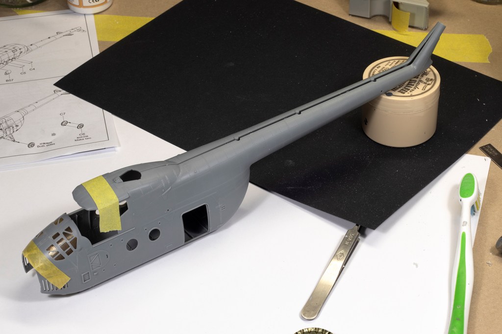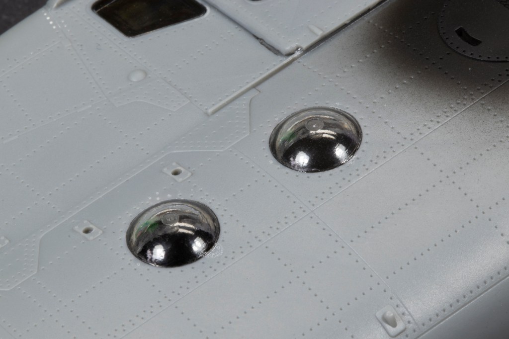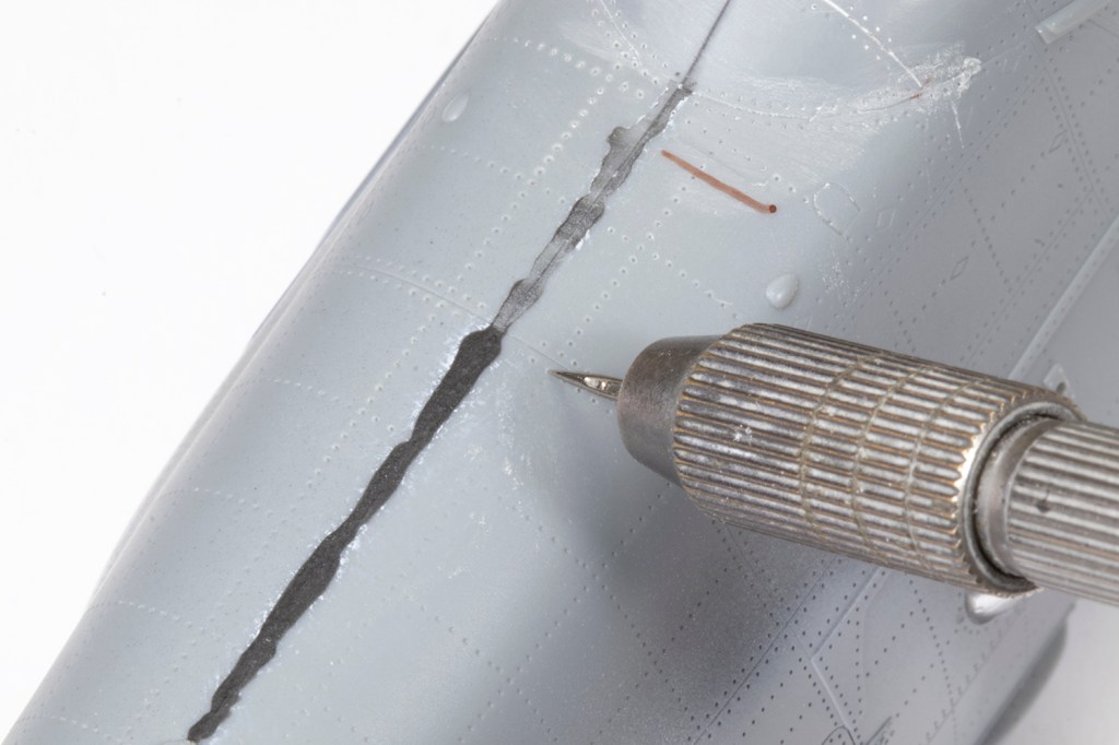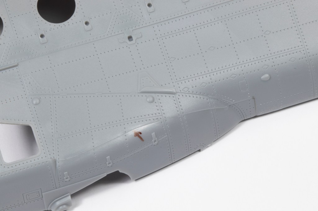 Eventually the fuselage halves came together and fitted pretty well except around the upper nose. I covered the entire seam in black CA and VMS filler powder anyway. When examining the tail boom I noted that several panel lines did not carry over from one half to the other. These were scribed in easily enough, but the soft plastic doesn’t take a scriber very well. The rivets also inevitably wash out towards the edge of the parts and I painstakingly reinstated each of them with a needle.