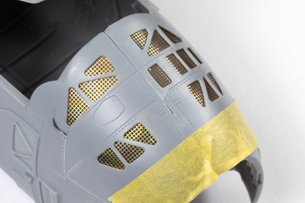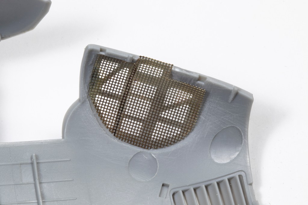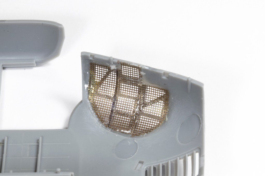 Finding a fine enough mesh is not easy and rather than spend ages trying to source some, I used a generic sheet of Eduard PE mesh I had lying around. It’s rather too coarse, but definitely better than the moulded plastic. I stuck some masking tape on the inside of the nose and drew on this the shape of PE I would need. With this overlaid on the PE sheet, the mesh could be cut to shape and glued from the inside. In the end I was pretty happy with my attempt.