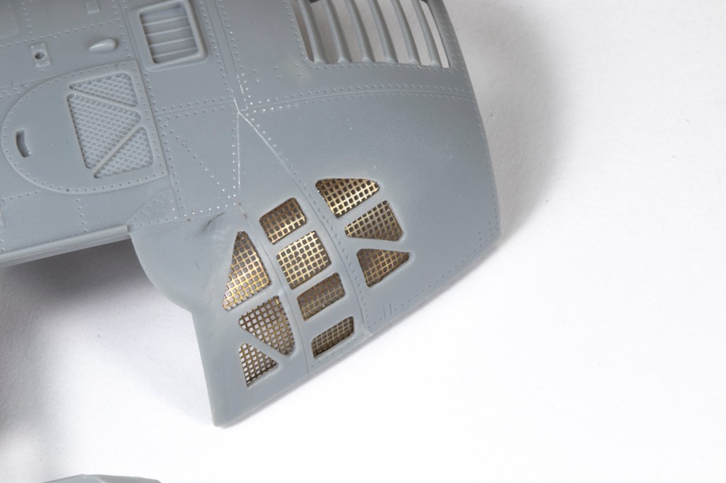 I’ve never been any good at removing sections of fuselage neatly, but wanted to try anyway. I started with various grinding bits in a Proxxon motor tool and milled away the centres of the moulded mesh sections. The plastic is pretty thick and this took a while. I could then refine the shape properly with some Sujiborido metal files, taking it slow and frequently changing file to make best use of the different shapes I had available. After some time, I had the holes cut out. Next was to reduce the thickness of the plastic from the inside, again with a motor tool along with a scalpel and chisel where appropriate. The plastic was still much thicker than it should be, but I needed to keep some thickness so the plastic would withstand filling and sanding across the fuselage joint.