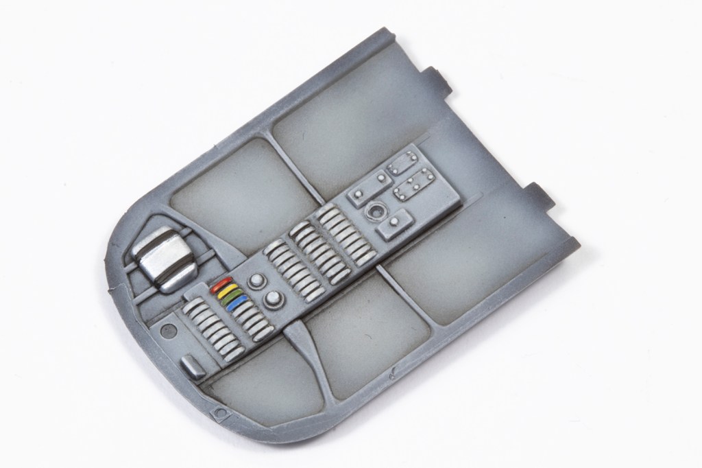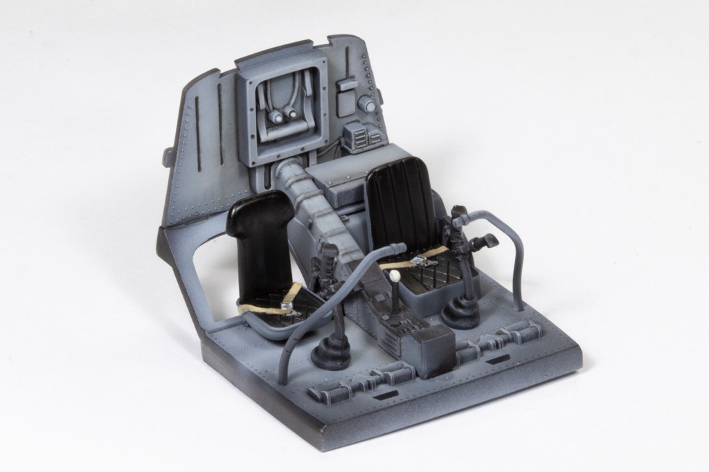 The cockpit, on the other hand, is very visible. I kept everything out of the box aside from some ANYZ etched belt buckles threaded with thin strips of Tamiya tape. Trumpeter provide instrument decals but I used some Airscale dials instead – definitely not accurate, but whatever fitted the bezel. Despite the extensive canopy glazing, the panel is very difficult to see. I drybrushed it with ever-lighter layers of grey oil paint, locking each shade in place with lacquer matt varnish before applying the next, paler shade. This way I never have to wait for the oils to dry and the entire panel can be done in a few minutes.