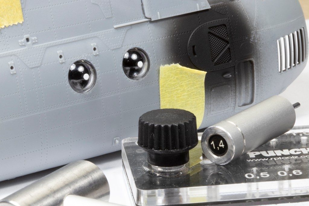 Before closing the fuselage halves I had to figure out how to bulge the windows. I needed five as the cabin door was often fitted with a flat window. On the off chance, I checked my spares box and found six unused bulged windows from an Academy CH-46 kit. These fit the bill almost perfectly, and although the shape is not exactly right, it was good enough for me. When fitted they looked pretty ugly on the inside, but as already mentioned, this would be invisible. Hound windows had circular openings in the centre which were gun ports, and these often seemed to be plugged. I drilled a shallow hole using a 1.5mm Godhand Spin Blade and then dropped in some 1.4mm discs punched from thin plastic card. I didn’t get the locations perfect, but again, good enough.