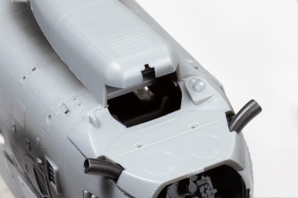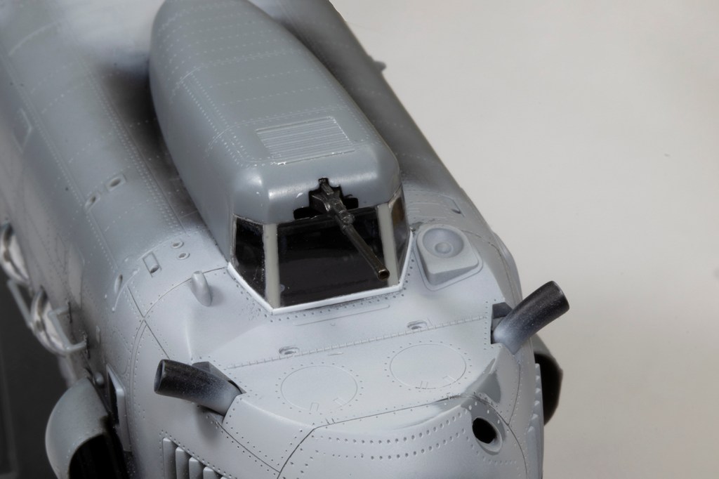 With the cabin windows sorted, the biggest challenge was scratchbuilding the transparencies for the front of the gun gondola. I started by dry-fitting the gondola in place and then using some spare plastic strip to make the frame for window panes. This gave me the basic shape which I could fill with panels of clear plastic cut from the windscreen of a discarded Revell MH-60L kit. This was all very rough and ready and the gaps were filled with superglue. I gently adjusted the shape of the windows until it fitted adequately to the lower fuselage. Try as I might, I couldn’t figure out a way to add the gun after the gondola, so it was added as per the instructions (downloaded from https://www.1999.co.jp/eng/plamo/ since my boxing marked these parts as Not For Use) and made do with cutting part of the barrel off to be replaced later with Albion Alloys brass tubing.
