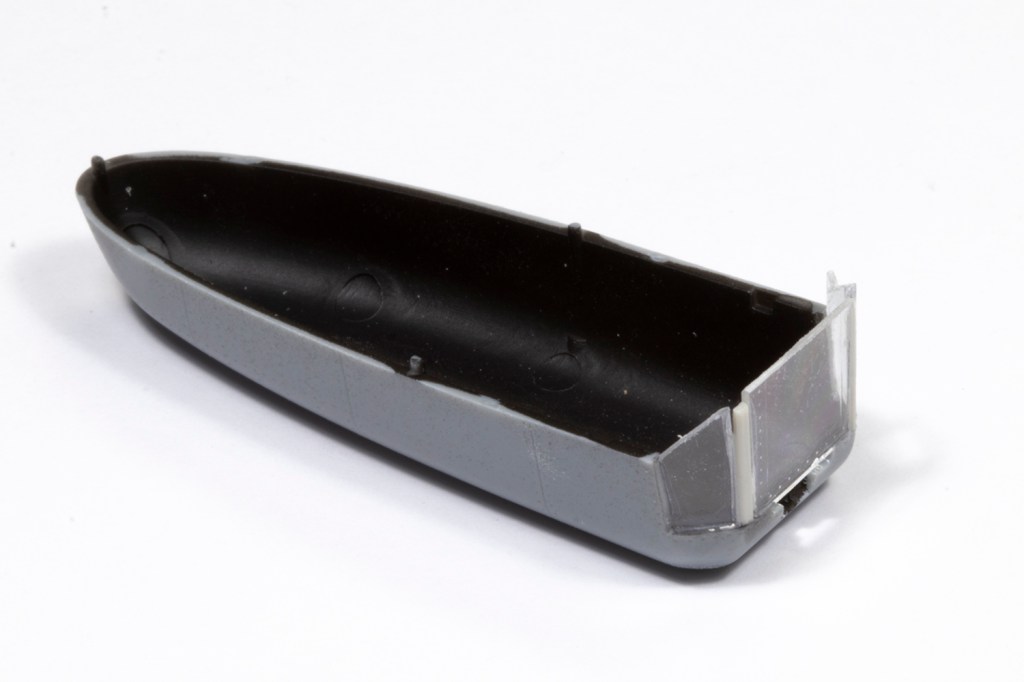 A surprisingly complete engine is included, the rear half of which will be completely invisible, and the front half just discernible through the cooling vents in the nose. There are lots of grilles moulded in solid plastic in the nose over the engine section and I decided to open these up. In theory this would mean the rear of the engine could be seen, although only if you looked really hard and with a good torch.