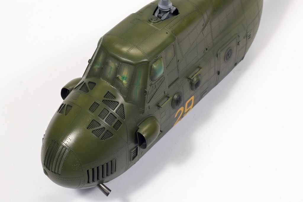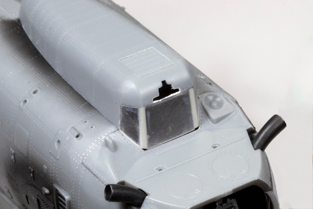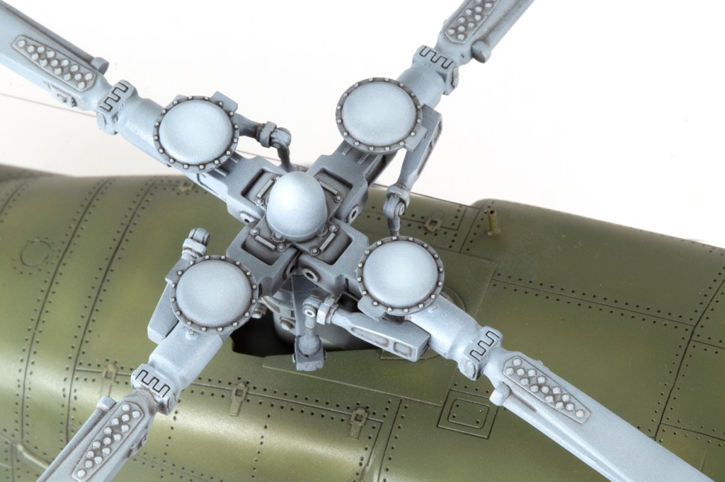 One might as well pause to mention the rotor blades. I feel these are the tank tracks of helicopter modelling – tedious, repetitive and generally they get in the way, especially when they are as big as these. The Hound has a rotor diameter larger than a Sea King or a Merlin, and Trumpeter were forced to make them in a way that means the blades cannot be detachable. Below the main rotor head is another ring which mounts over the mast. This is attached to the blades by some actuating arms, meaning the whole lot has to be built up while fitted to the main body so the parts all line up. What is excellent, however, is that Trumpeter moulded in the significant droop, which is a big improvement over their earlier 1/35 scale kit of the Hound. The rotor head is horizontally split, which makes for a difficult seam to clean up in the recessed areas; I covered them with some scrap PE cut to shape.