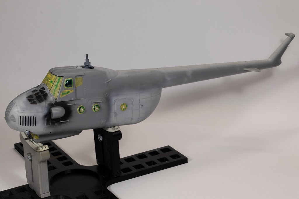 While masking out the blue, I realised I’d done something wrong with the horizontal stabilisers on the tail. I’d blindly followed the instructions, but the vast majority of photos of Mi-4s on the ground show them deflected with the leading edge down. The attachments are circular, so this would have been easy to do had I seen it in time, but I didn’t. With the blue masked off, the Black Green was applied, and then highlighted with Akan Lemon Grey. I know that in real life the actual thing was probably a very uniform shade of semigloss green, but I think that looks a bit boring, so adding in a lot more contrast was an artistic choice I wanted to experiment with. Over this ‘preshading’ went Akan 63017 Green (which I don’t think is quite the right shade, but close enough), sprayed nice and thin. The last touch was to create some masks for the ’29’ by tracing the photograph in Inkscape and cutting it out of vinyl with my Silhouette machine. I had to guess at the colour (the photo is black and white), but yellow seemed pretty common for Soviet Hounds. it’s possible it should be edged in black, but I couldn’t make that out and wanted an easy life. As usual, I took things for granted, didn’t look closely enough at the photo when applying the masks, and so they’re too far aft – they should be centred under the forward cabin window.