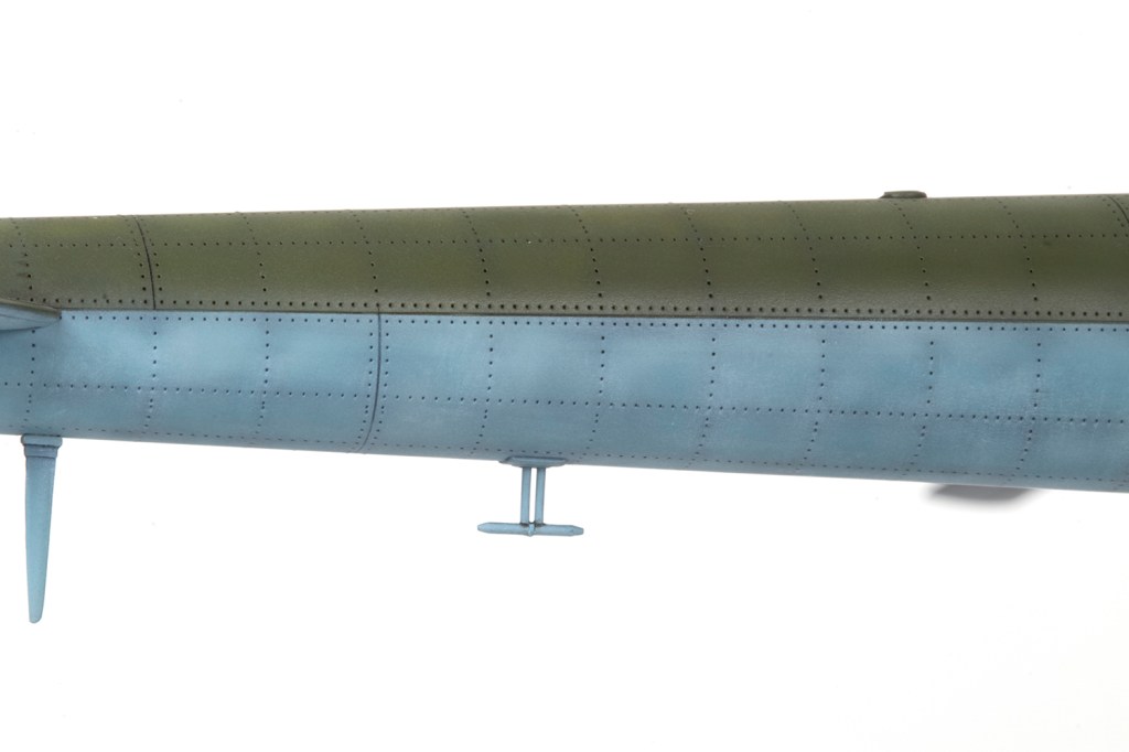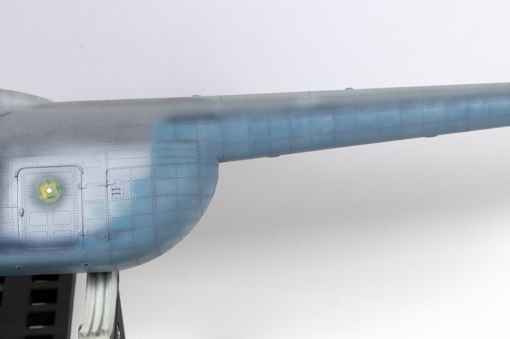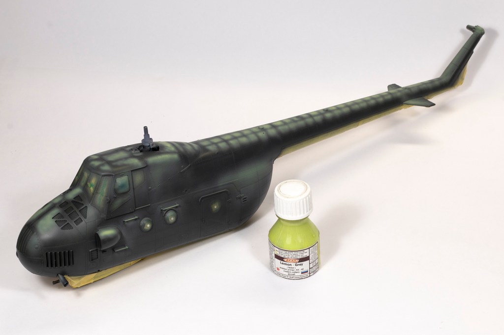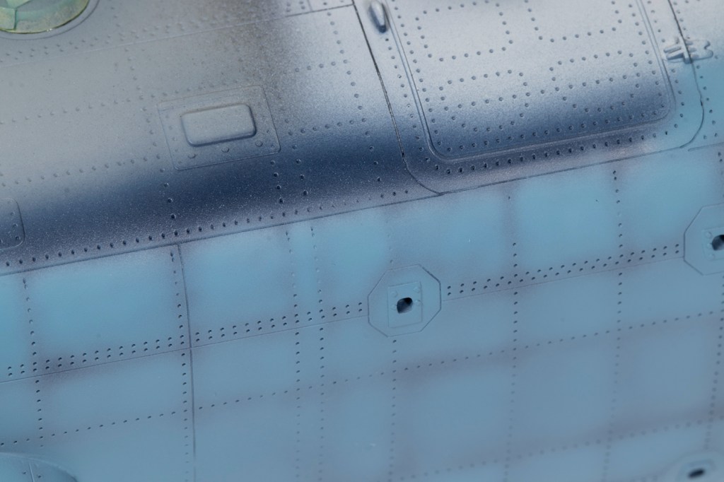 My paint of choice for the simple blue and green scheme was Akan lacquer. I couldn’t tell you the product number for the blue because the label had long fallen off, but decanted and heavily thinned with Mr Leveling Thinner it sprayed beautifully. This blue shade was too vibrant for my liking, so I mixed it with more and more light grey (also by Akan) to fade and desaturate it. This produced a pleasingly patchy finish. It’s worth noting that the green/blue demarcation varied a lot, especially around the rear clamshell cargo doors and the very end of the tail boom. The main undercarriage legs could also be blue or green – mine were definitely blue.