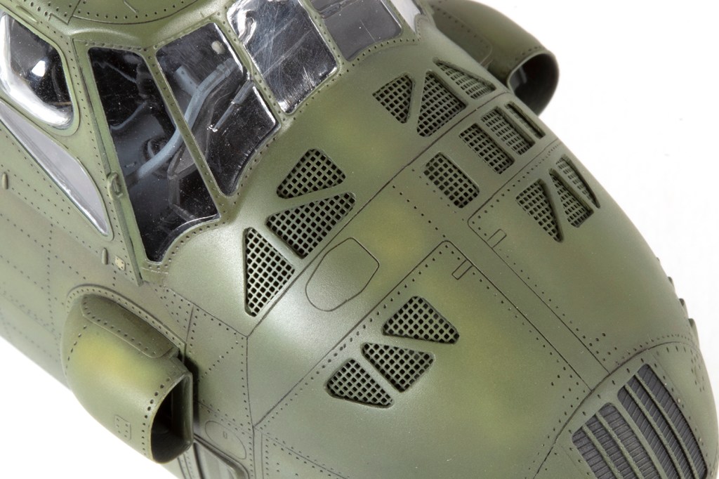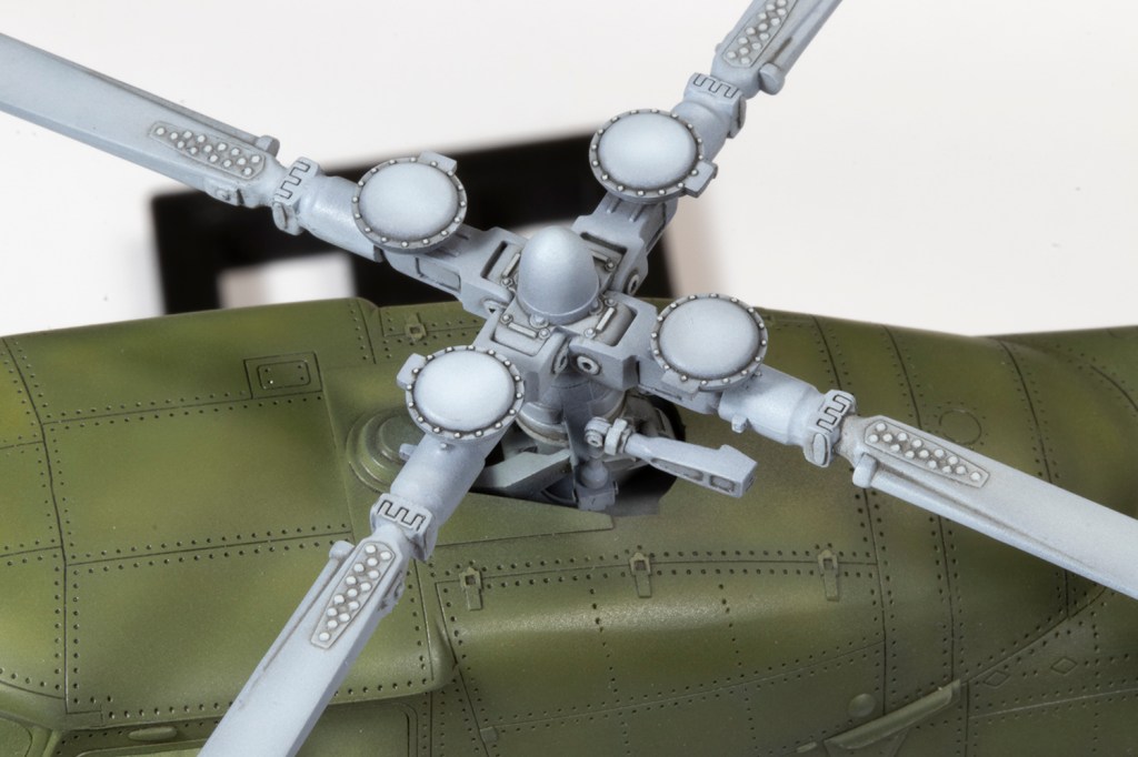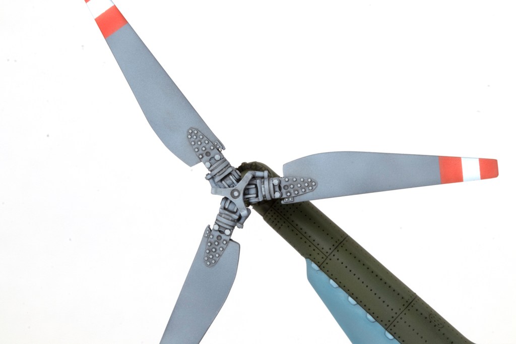 More contrast was added via oil paints – ABT502 Paynes Grey for the blue, and Starship Filth and Sepia over the green. I learned that, unlike most lacquers, Akan paints will lift if scrubbed with AK Interactive’s mineral spirits, so some touching up was necessary, which added to the overall tonal variation. Highlights were added to raised features, especially on the rotor head and tail rotor, with brush painted shades mixed from acrylic paints. Tips of the tail rotors were masked and airbrushed in red and white.