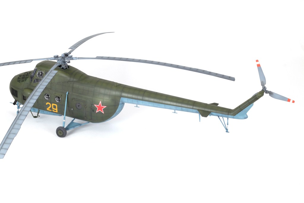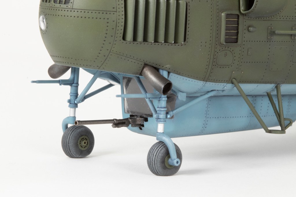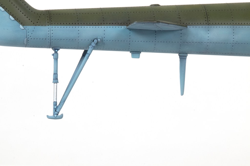 With paint done, a host of minor things needed to be dealt with. Trumpeter don’t provide anything close to an accurate aerial fit (and this varied quite a lot, so go with a photo). I had to scrounge one aerial under the tail boom from the spares box and use a kit item, erroneously marked for the upper fuselage, to go under the tail planes. The cockpit door handle can be removed from the starboard side (I think) and the oleos covered with strips of ANYZ aluminium decals. Talking of decals, only two were added – the Soviet stars from the Trumpeter sheet – and they conformed to the surface detail beautifully. And talking of oleos, most photos seem to show these much more extended at the front.