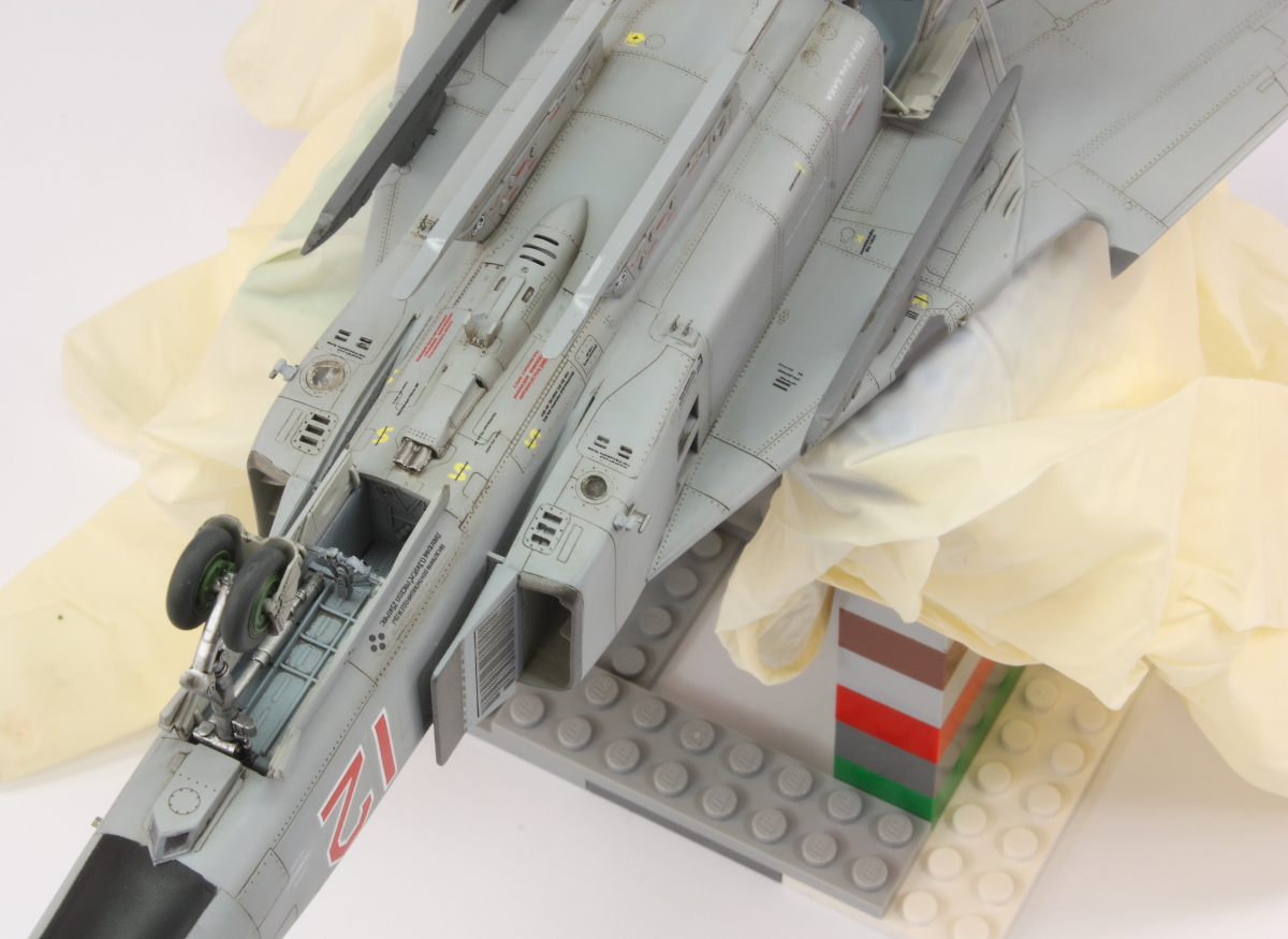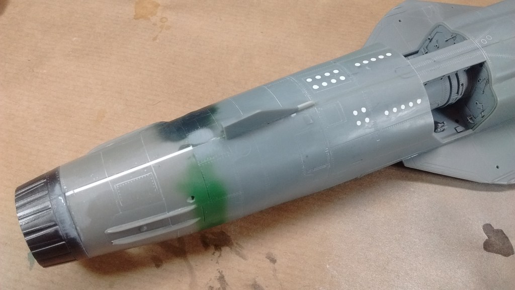 Once all that had been masked off, I airbrushed the whole airframe with the relevant Akan grey through my RG-3. Because I was nervous about running out of paint, I sprayed it on quite thin and dry, which meant the finish around the fin area was unfortunately quite rough. I mixed a slightly darker shade of this grey and applied that to the lower rear fuselage as indicated in Linden Hill’s instructions for a grey Flogger-B. This was all very pleasing (aside from the awful canopy).