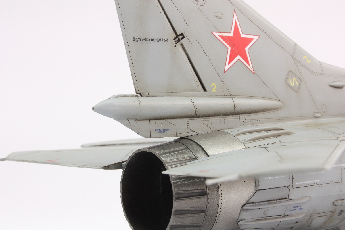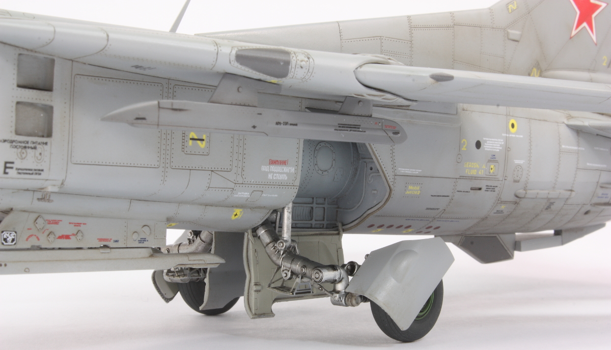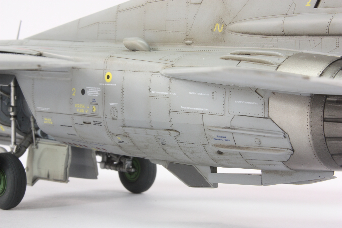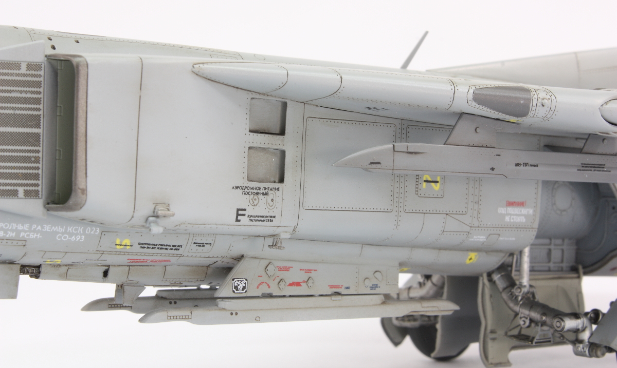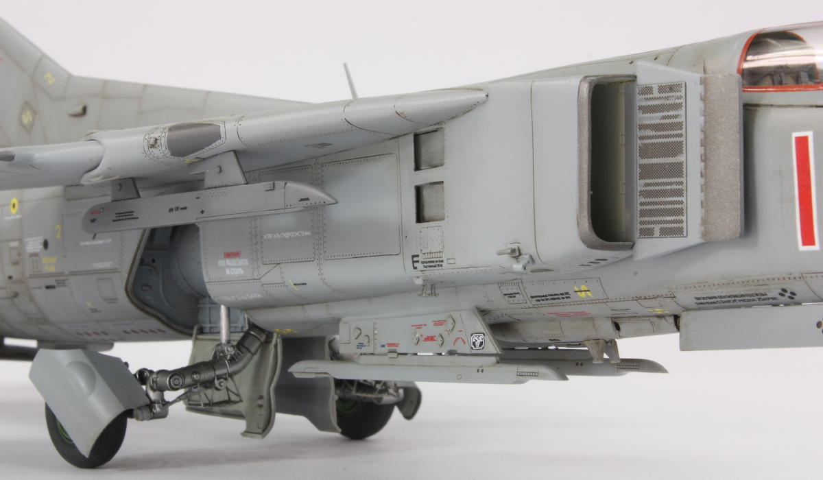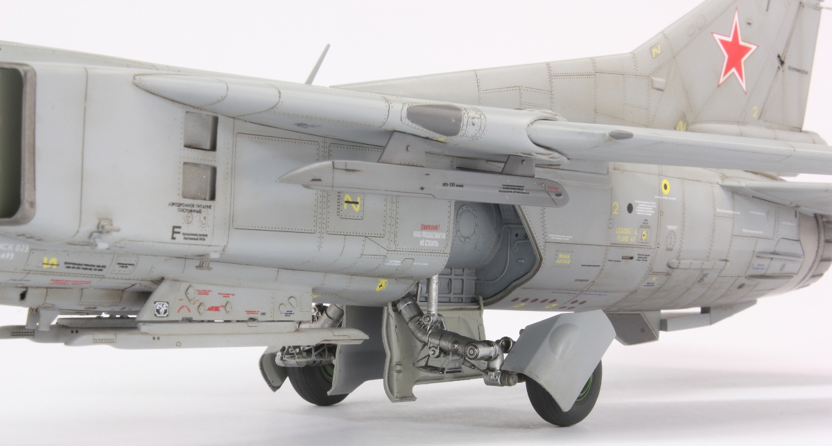 - The ventral fin is completely wrong for a Flogger-B, because it lacks the leading edge extension necessary for the MiG-23M and because the engraving is wrong (as are the painting instructions). There is no resin replacement on the market for this, so I scratchbuilt it.
