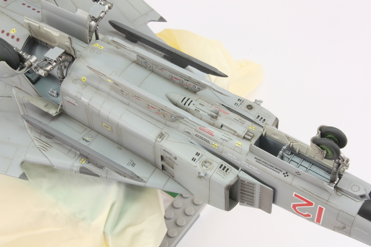 Before paint was committed, I needed to deal with the undercarriage. This is probably the most complex undercarriage I’ve ever made. After looking at it for a long time, I decided to build each unit in situ without gluing anything into the bay. So, for the right side that meant attaching parts D11, C29, C39, D2, C15 and L2 all together and checking it fitted all nice and square into the main undercarriage bay. The complete unit was then removed and painted with Mr Color 8 Silver. This was repeated for the left side and I did a similar thing for the nose gear. At the end these all then just slotted into place. The little square doors (parts C7/19 with PE additions) were not used as Eduard provide PE replacements in their wheel set; the same is true for parts C13/12, which were attached at the very end. The Brassin wheels are beautiful but I didn’t bother with all of the PE details; I don’t find the payoff worth the hassle. I painted the tyres with Mr Color 77 and the hubs with Akan’s green paint formulated for this purpose. Undercarriage bays were painted Mr Color 308 and the inside of the doors was Mr Color 60. These are simply the provided recommendations; I don’t claim they are accurate. The nose gear leg is not right for a Flogger-B and my only superficial concession to this was to omit part L12. The result still doesn’t bear much resemblance to reality.