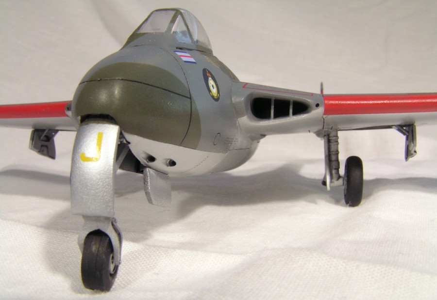 In terms of detail, the really weak point of these Vampire kits is the poorly detailed landing gear. The mainwheels are nice, but nothing else is. The noseleg, in particular, is not well engineered and has in my case resulted in an asymmetric structure. One mistake of my own making is that I neglected to remember that the centre of gravity is a direction, not just a location. Therefore, whilst I had ensured that there was enough noseweight to keep the tail up if the fuselage is horizontal, I had not realised that the Vampire had a significant nose-up attitude. Fortunately, the rear bulkhead at the end of the exhaust had come adrift and I was able to drop bits of lead into the fuselage to balance things up.